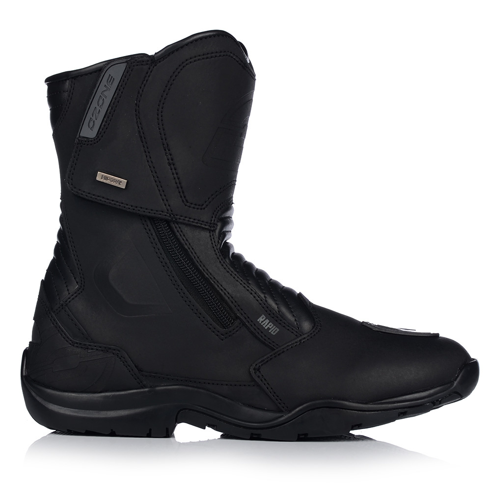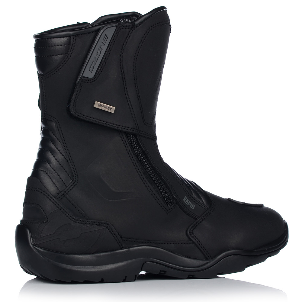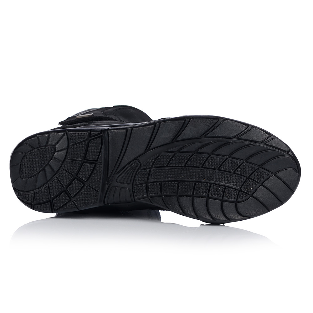 Skórzane buty motocyklowe z gumową podeszwą i wyściółką poliester mesh. Mają wodoodporną, oddychającą membranę HIPORA, usztywniony czubek oraz wzmocnienie pod dźwignię zmiany biegów. Zapinane na obustronny zamek i rzep. Antybakteryjna wkładka i elastyczne panele zwiększają komfort użytkowania.