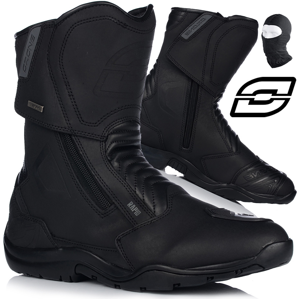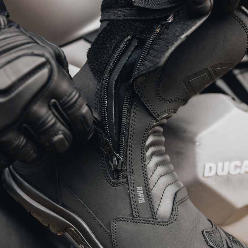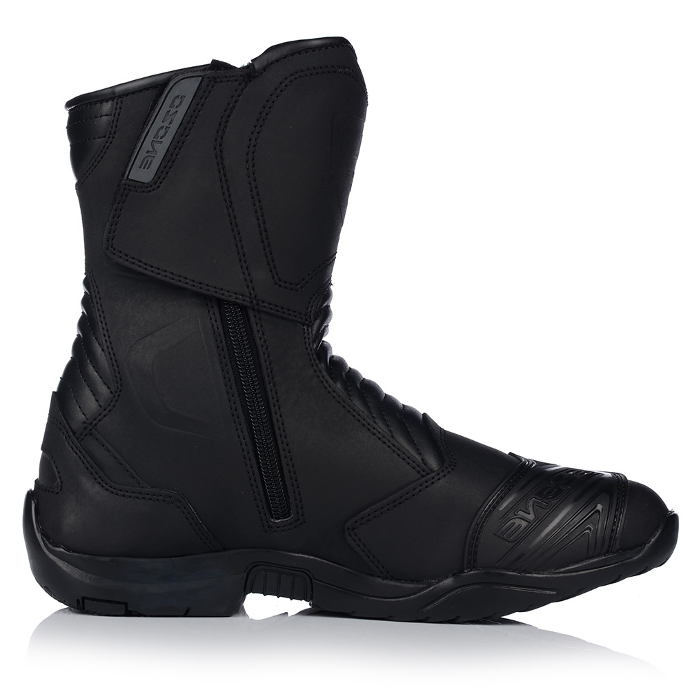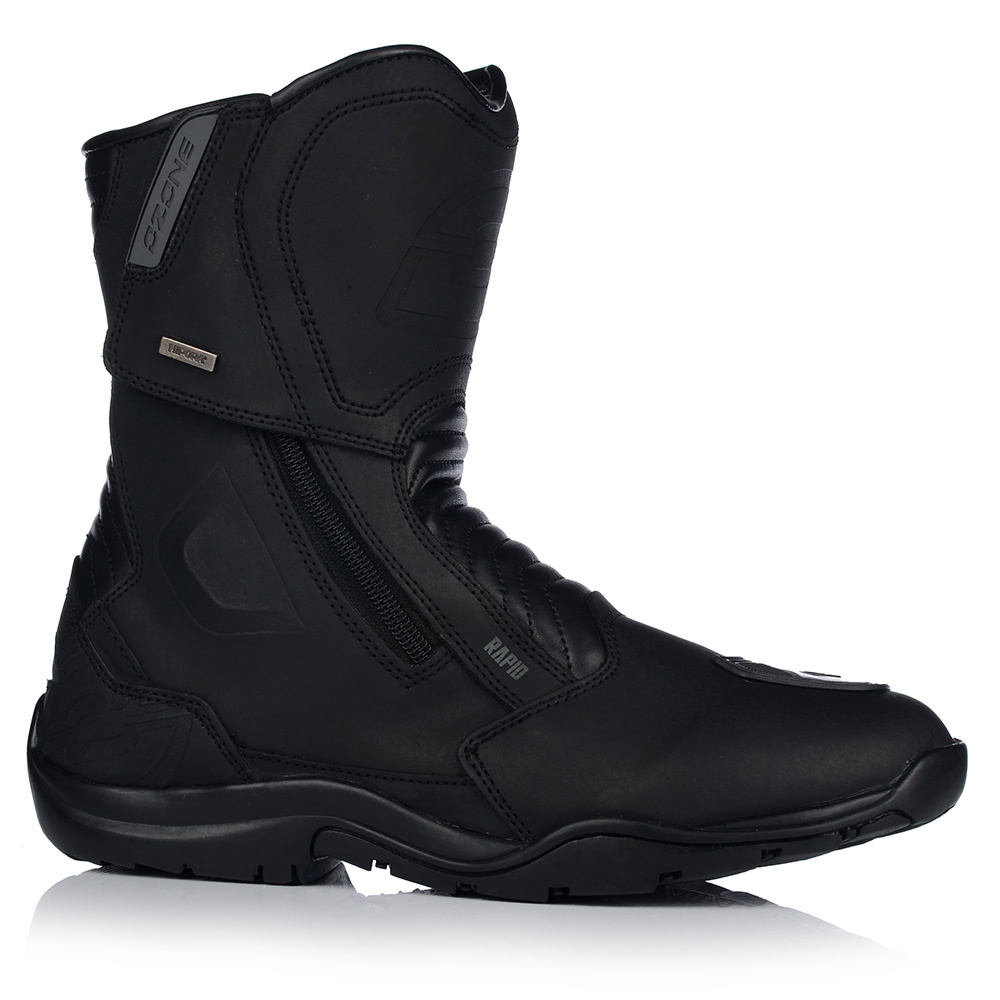 Skórzane buty motocyklowe z gumową podeszwą i wyściółką poliester mesh. Mają wodoodporną, oddychającą membranę HIPORA, usztywniony czubek oraz wzmocnienie pod dźwignię zmiany biegów. Zapinane na obustronny zamek i rzep. Antybakteryjna wkładka i elastyczne panele zwiększają komfort użytkowania.