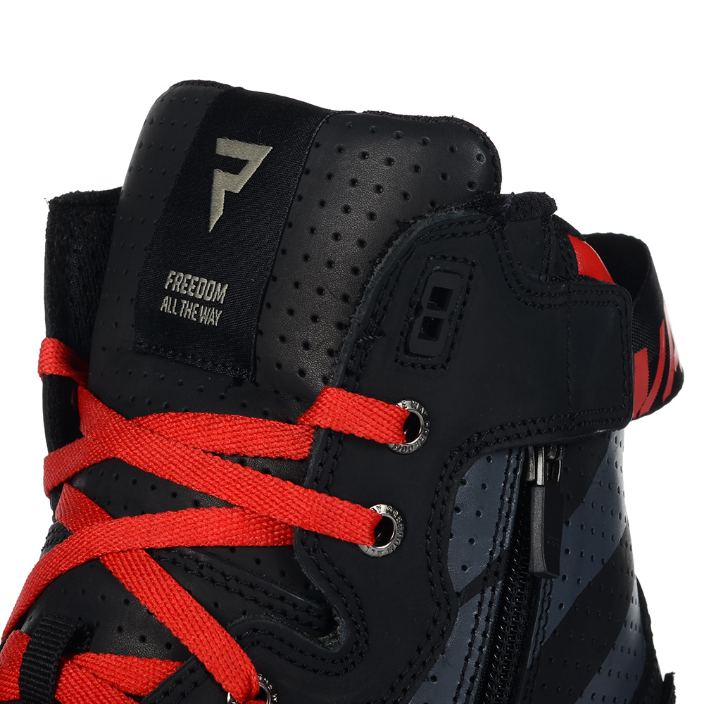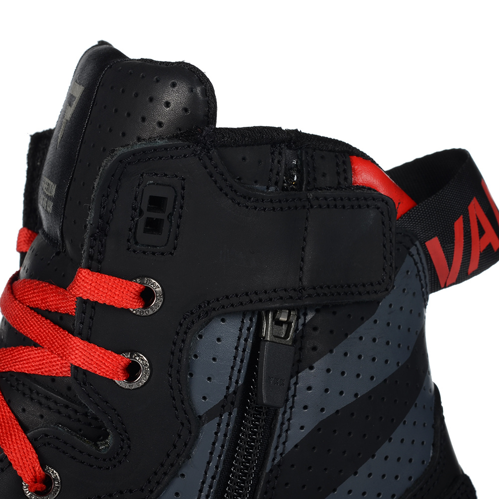 Buty motocyklowe Rebelhorn Vandal zostały uszyte ze skóry bydlęcej. Dobrą wentylację zapewniają perforowane panele i podszewka 3D mesh. Buty mają wzmocnioną podeszwę, twarde osłony pięt i kostek. Długi zamek z boku ułatwia ich zakładanie.