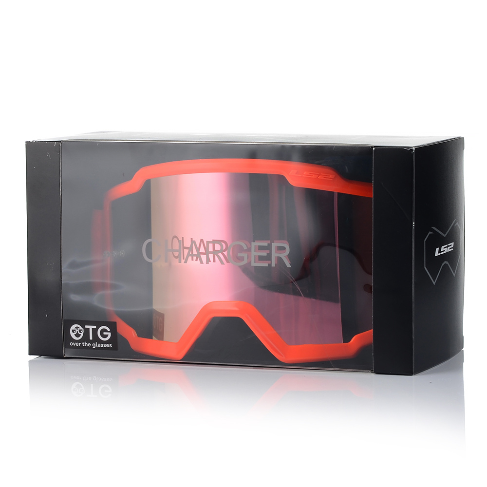 Gogle LS2 CHARGER o szerokim polu widzenia, wyposażone w soczewki Lexan zapewniające doskonałą odporność na uderzenia oraz ochronę przed promieniami UVA, UVB i parą. Trzy warstwy pianki chroniące przed kurzem i potem.