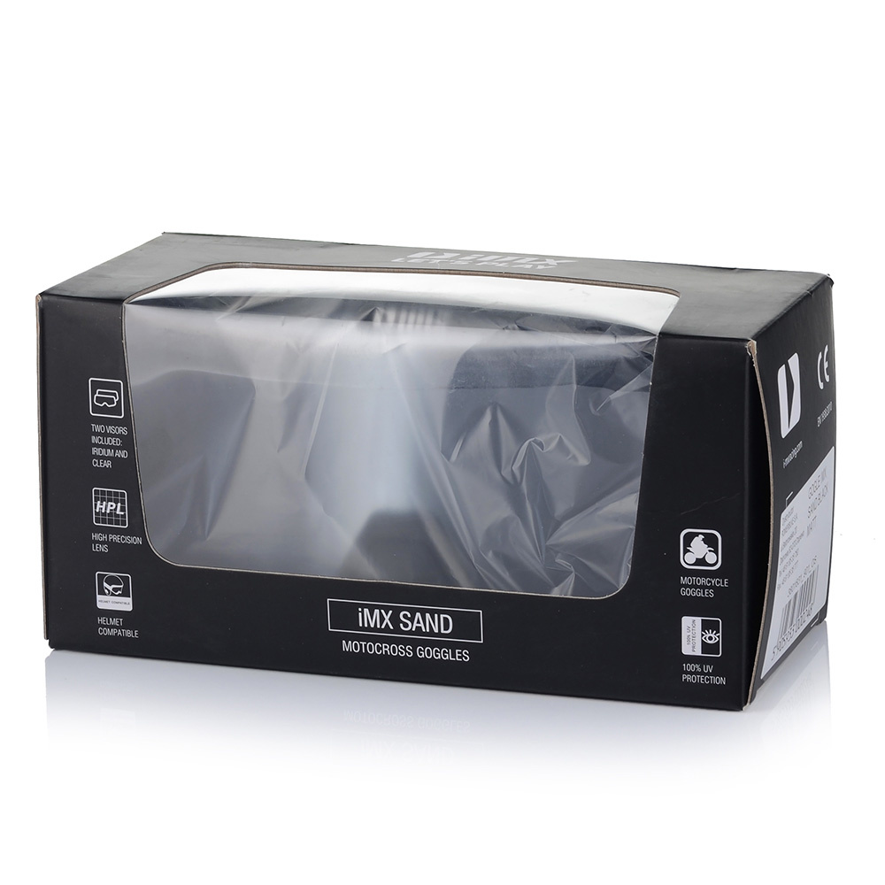 Gogle offroadowe IMX Sand charakteryzuje szerszy pasek z silikonem, zapobiegajacy zsuwaniu się podczas jazdy. Nieparująca szyba z powłoką AntiFog ma szeroki kąt widzenia i jest odporna na zarysowania. Gogle IMX Sand występują w zestawie z szybą Iridium i Clear oraz wymiennym noskiem i pokrowcem.