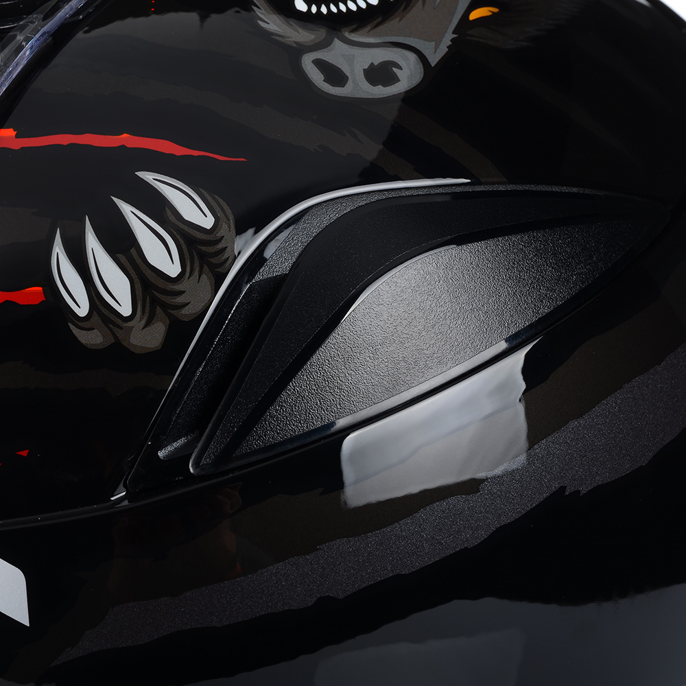 Szyba kasku jest odporna na zarysowania, parowanie i promieniowanie UV, a dodatkowo posiada piny, które umożliwiają mocowanie Pinlock'a. Deflektor nosa zapobiega parowaniu szyby, a ochrona podbródka zmniejsza hałas i zawirowania powietrza.