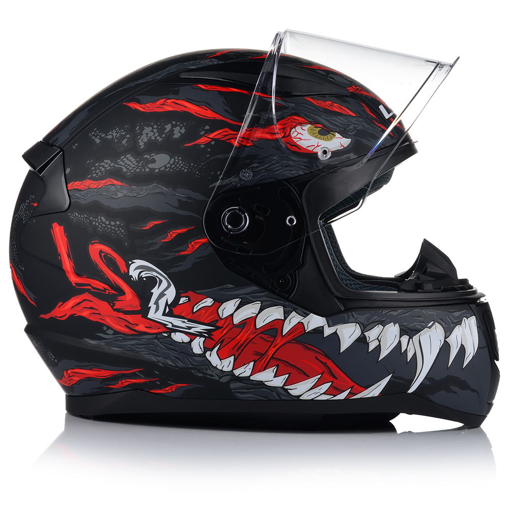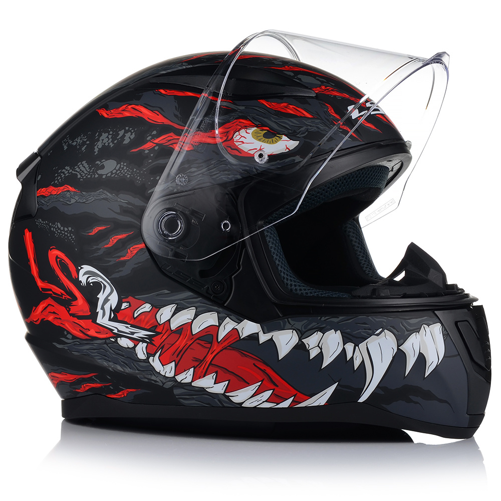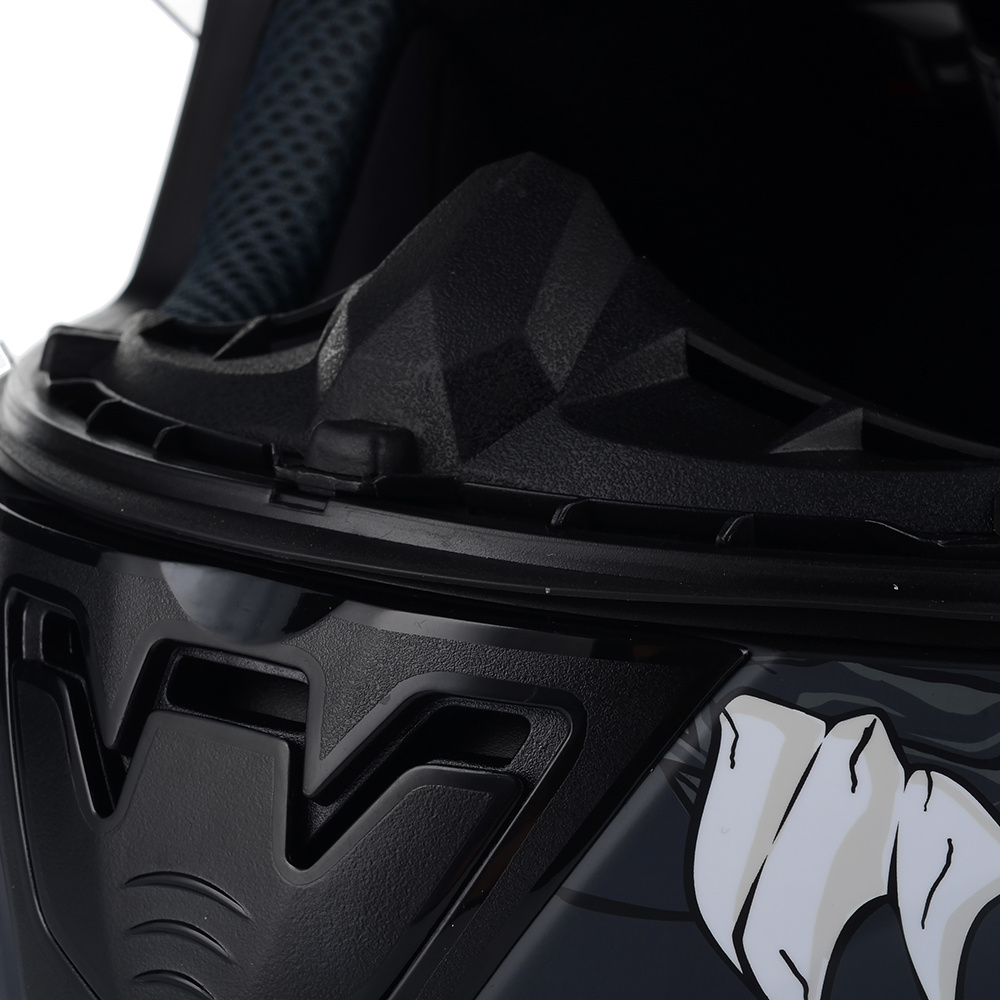 Szyba kasku jest odporna na zarysowania, parowanie i promieniowanie UV, a dodatkowo posiada piny, które umożliwiają mocowanie Pinlock'a. Deflektor nosa zapobiega parowaniu szyby, a ochrona podbródka zmniejsza hałas i zawirowania powietrza.
