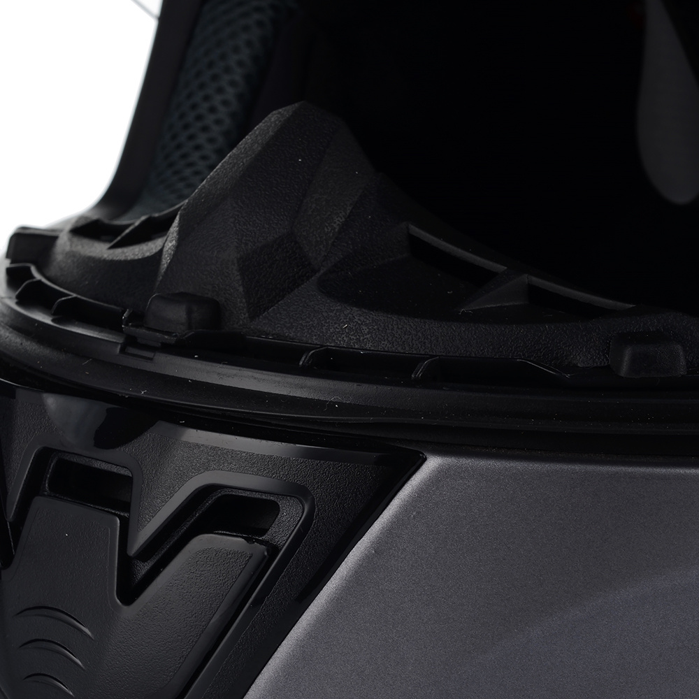 Szyba kasku jest odporna na zarysowania, parowanie i promieniowanie UV, a dodatkowo posiada piny, które umożliwiają mocowanie Pinlock'a. Deflektor nosa zapobiega parowaniu szyby, a ochrona podbródka zmniejsza hałas i zawirowania powietrza.