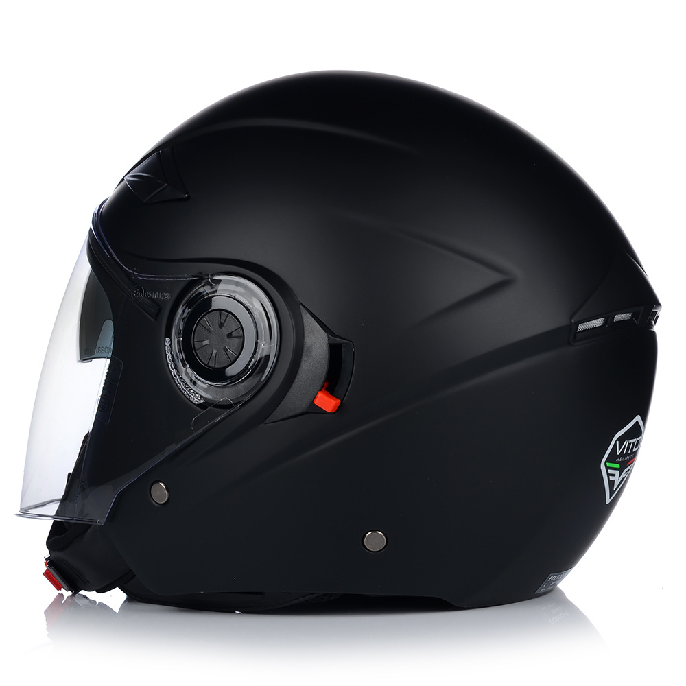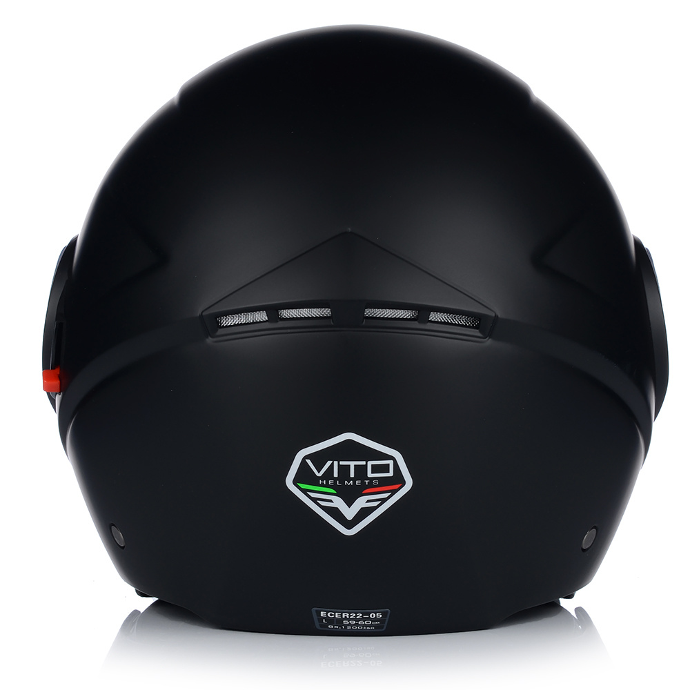 Kask VITO AMARO to bezpieczny kask motocyklowy, posiadający certyfikat bezpieczeństwa ECE R 22.05. Model ten posiada nowoczesną skorupę i jest wykonany z materiałów wysokiej jakości, dodatkowo posiada wbudowaną blendę przeciwsłoneczną. Waga tego kasku, to zaledwie 1200g. Idealny do jazdy miejskiej i turystycznej na skuterach i chopperach.