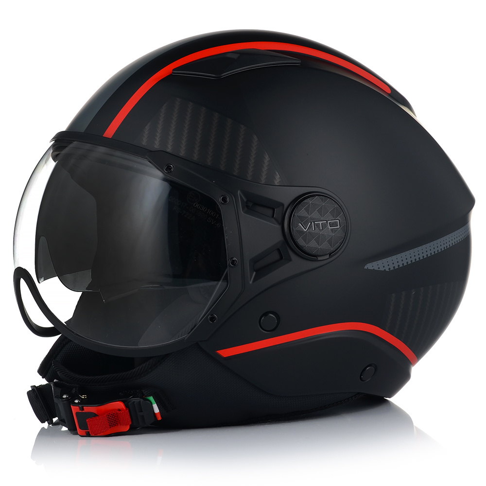 Kask VITO LAVORI to bezpieczny kask motocyklowy, posiadający certyfikat bezpieczeństwa ECE R 22.06. Model ten posiada innowacyjną skorupę i jest wykonany z materiałów wysokiej jakości. Waga tego kasku, to zaledwie 1100g. Idealny do jazdy miejskiej i turystycznej na skuterach i chopperach.