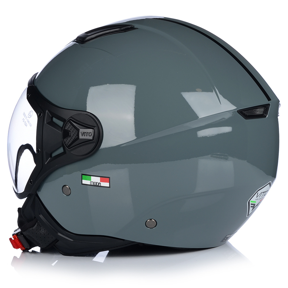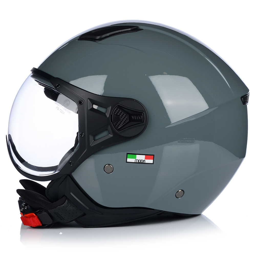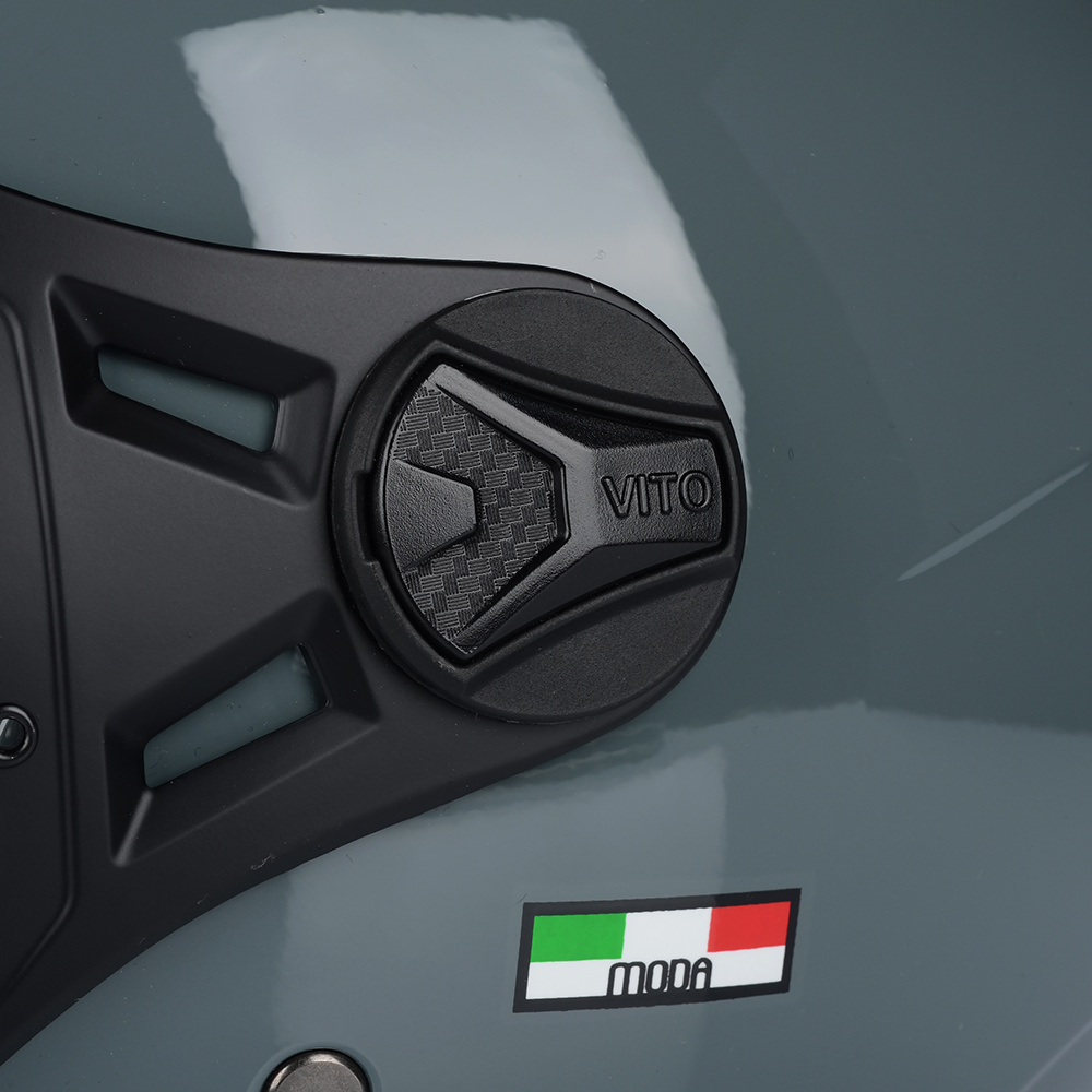 Kask VITO MODA to bezpieczny kask motocyklowy, posiadający certyfikat bezpieczeństwa ECE R 22.06. Model ten posiada innowacyjną skorupę i jest wykonany z materiałów wysokiej jakości. Waga tego kasku, to zaledwie 1100g. Idealny do jazdy miejskiej i turystycznej na skuterach i chopperach.