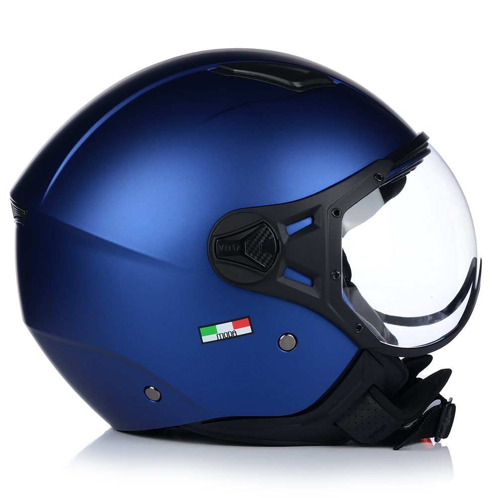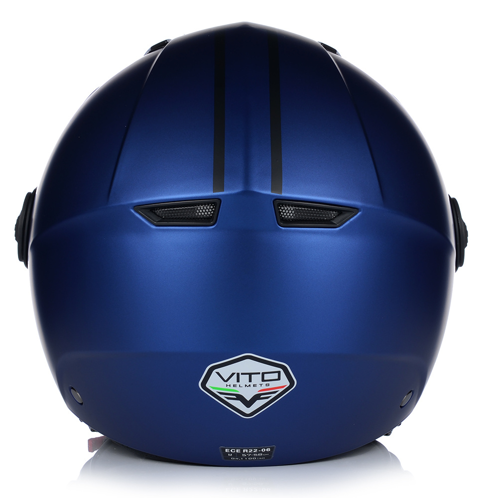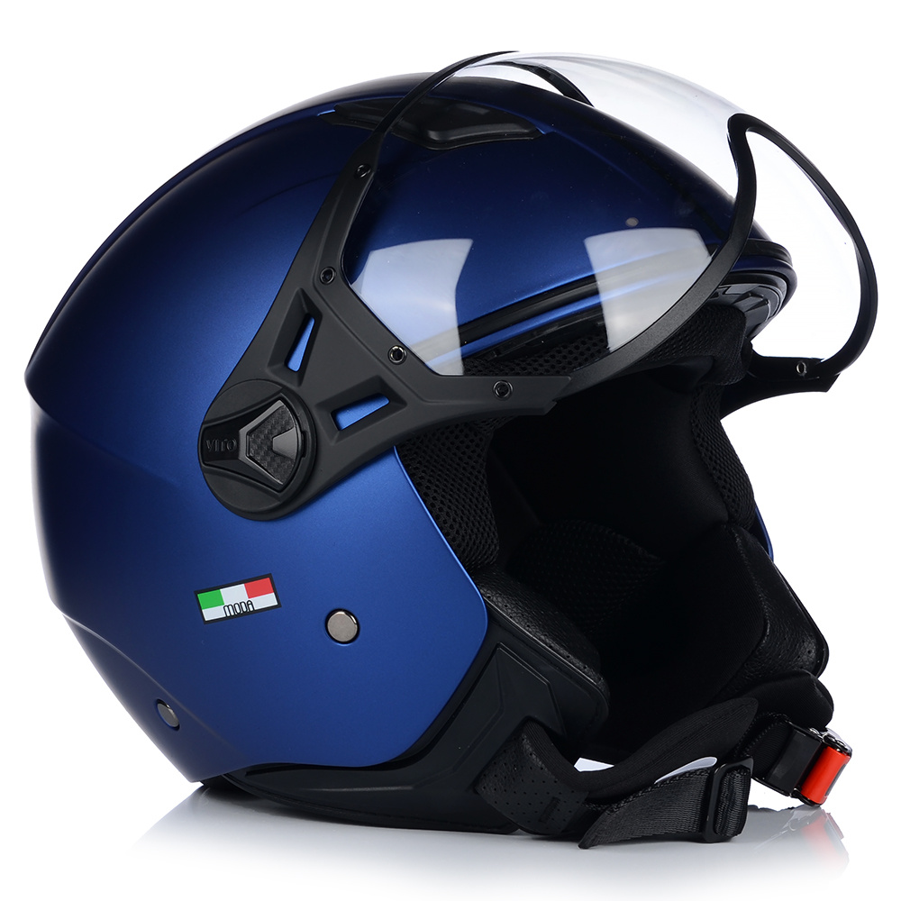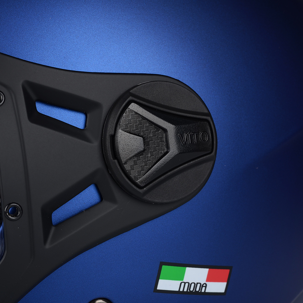 Kask VITO MODA to bezpieczny kask motocyklowy, posiadający certyfikat bezpieczeństwa ECE R 22.06. Model ten posiada innowacyjną skorupę i jest wykonany z materiałów wysokiej jakości. Waga tego kasku, to zaledwie 1100g. Idealny do jazdy miejskiej i turystycznej na skuterach i chopperach.