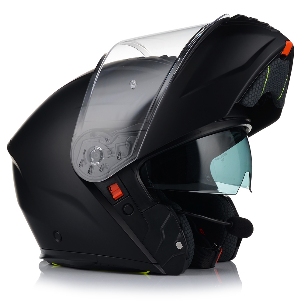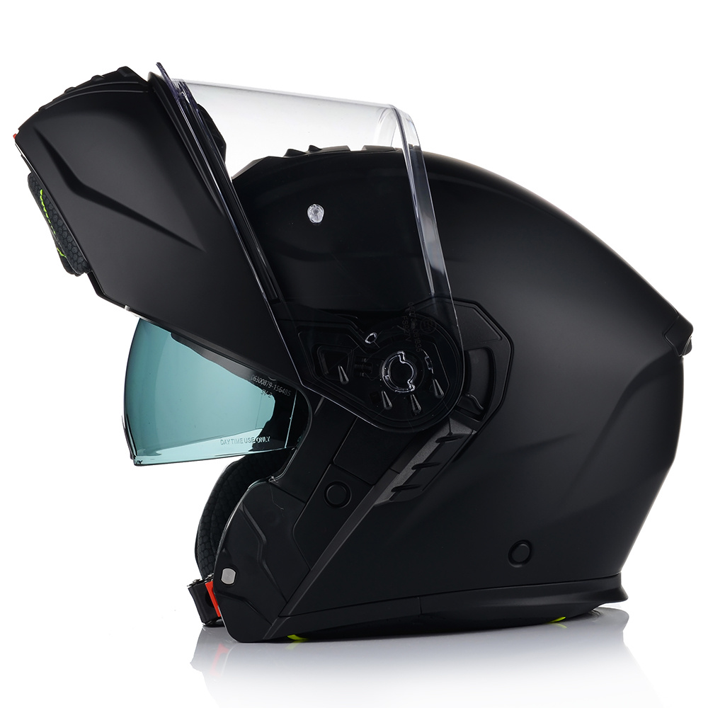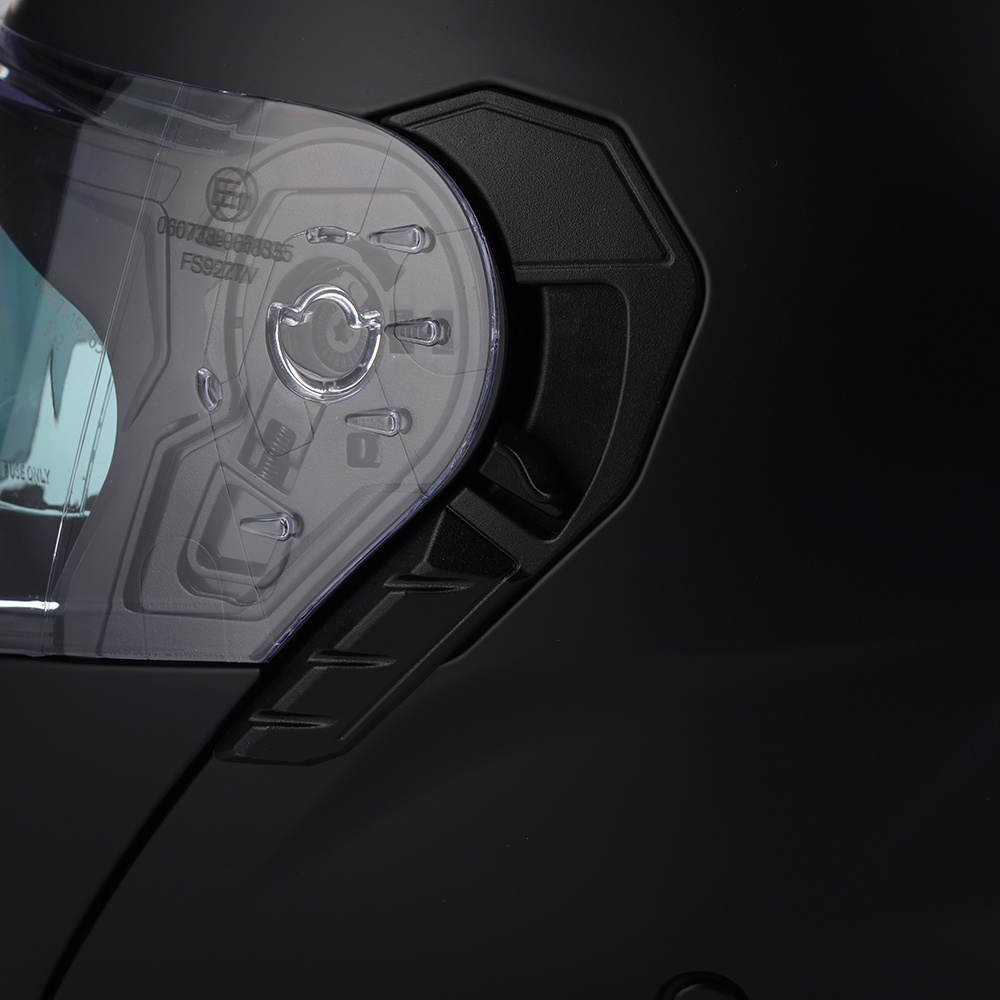 VITO FURIO jako jeden z nielicznych kasków posiada podwójną homologację - na jazdę z podniesioną i opuszczoną szczęką. Producent wyposażył produkt również w osłonę podbródka, oraz deflektor nosa, który zapobiega parowaniu szyby.
