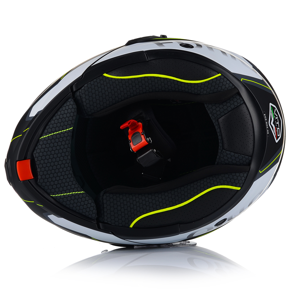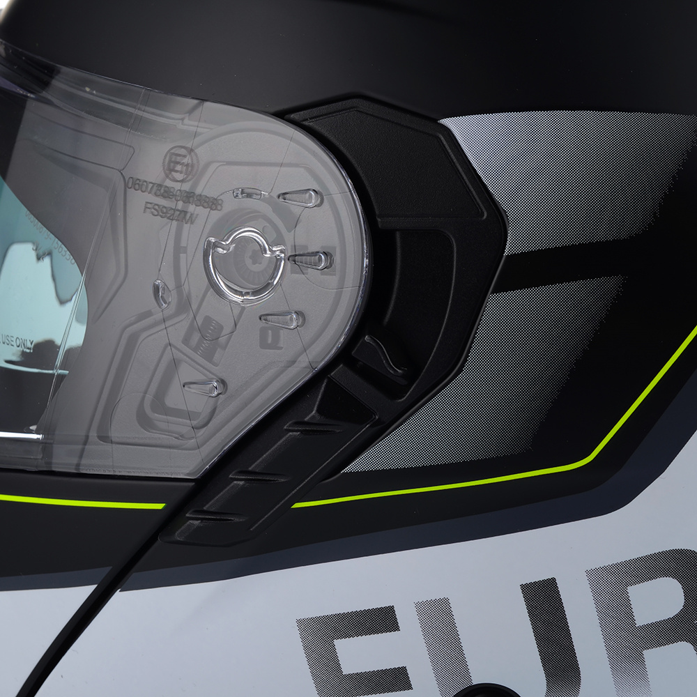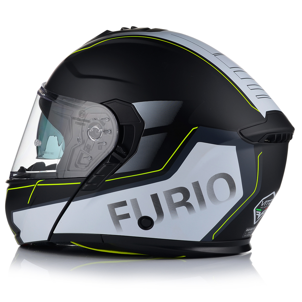 VITO FURIO jako jeden z nielicznych kasków posiada podwójną homologację - na jazdę z podniesioną i opuszczoną szczęką. Producent wyposażył produkt również w osłonę podbródka, oraz deflektor nosa, który zapobiega parowaniu szyby.