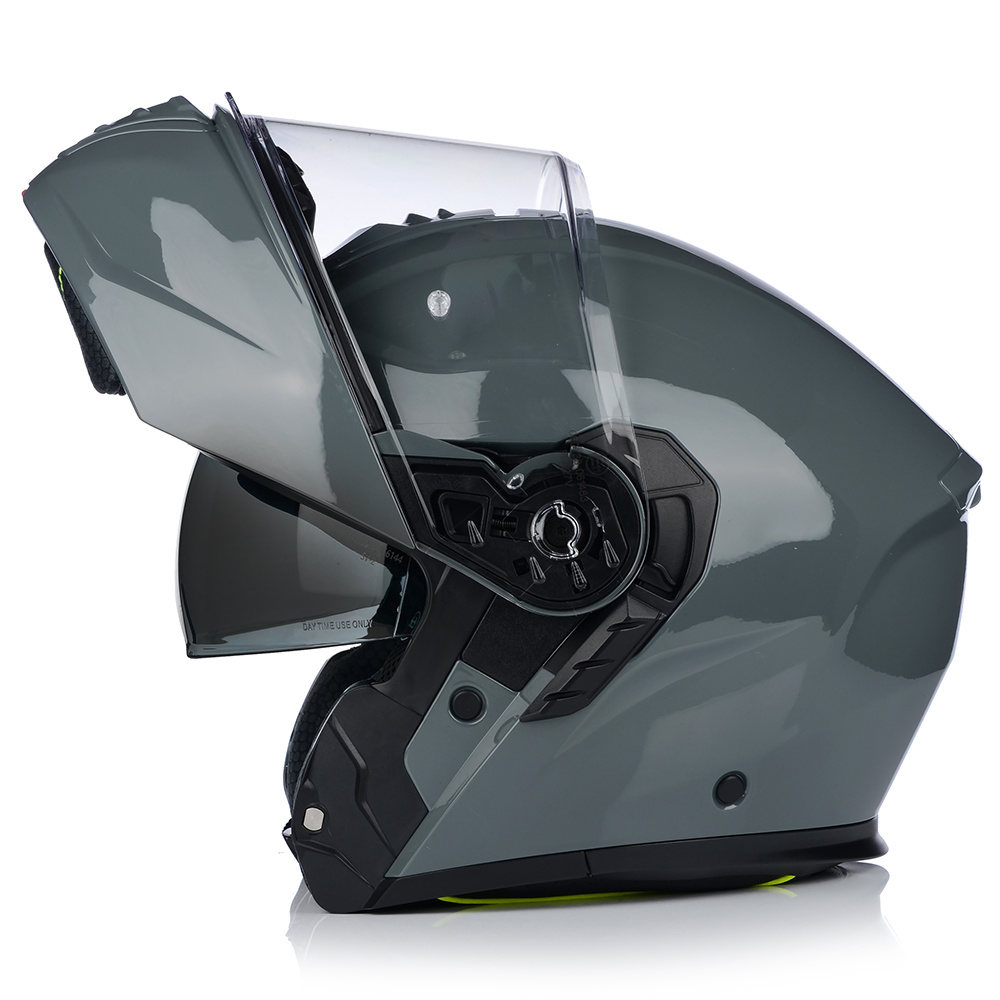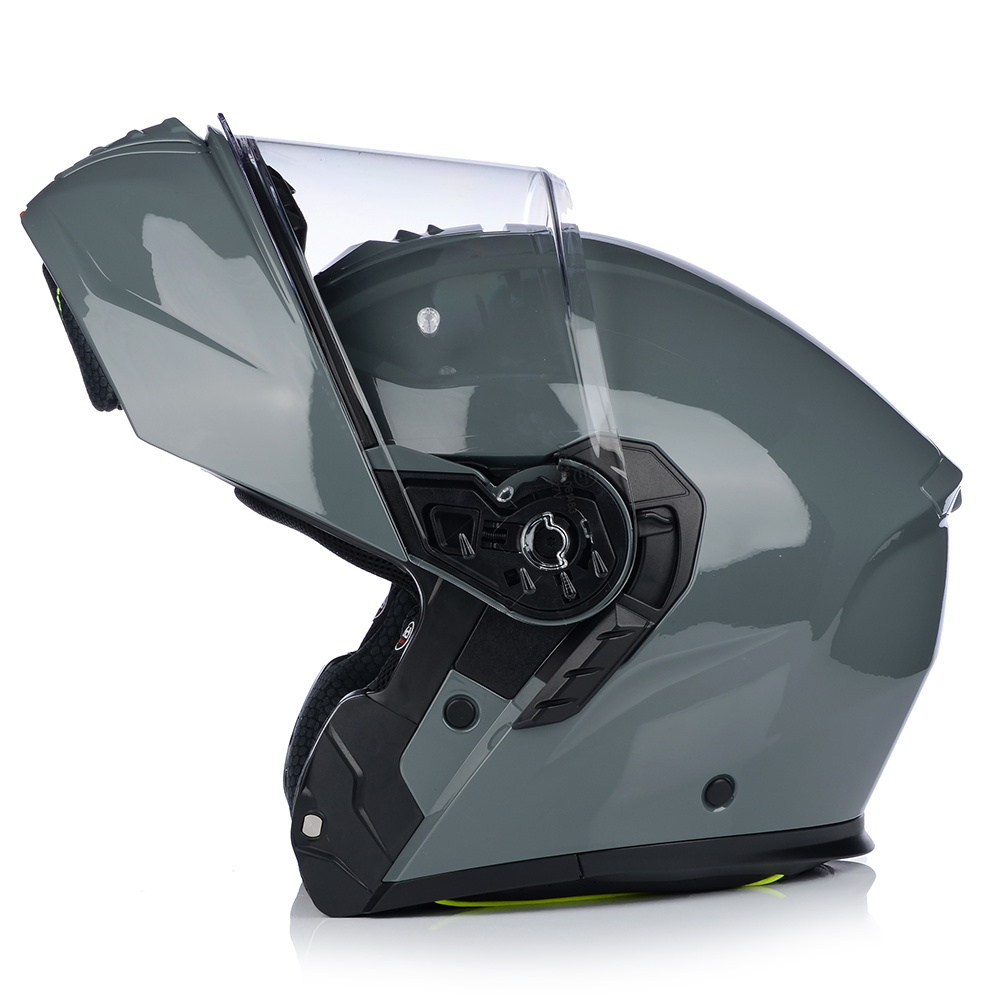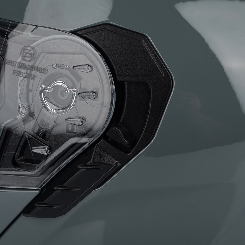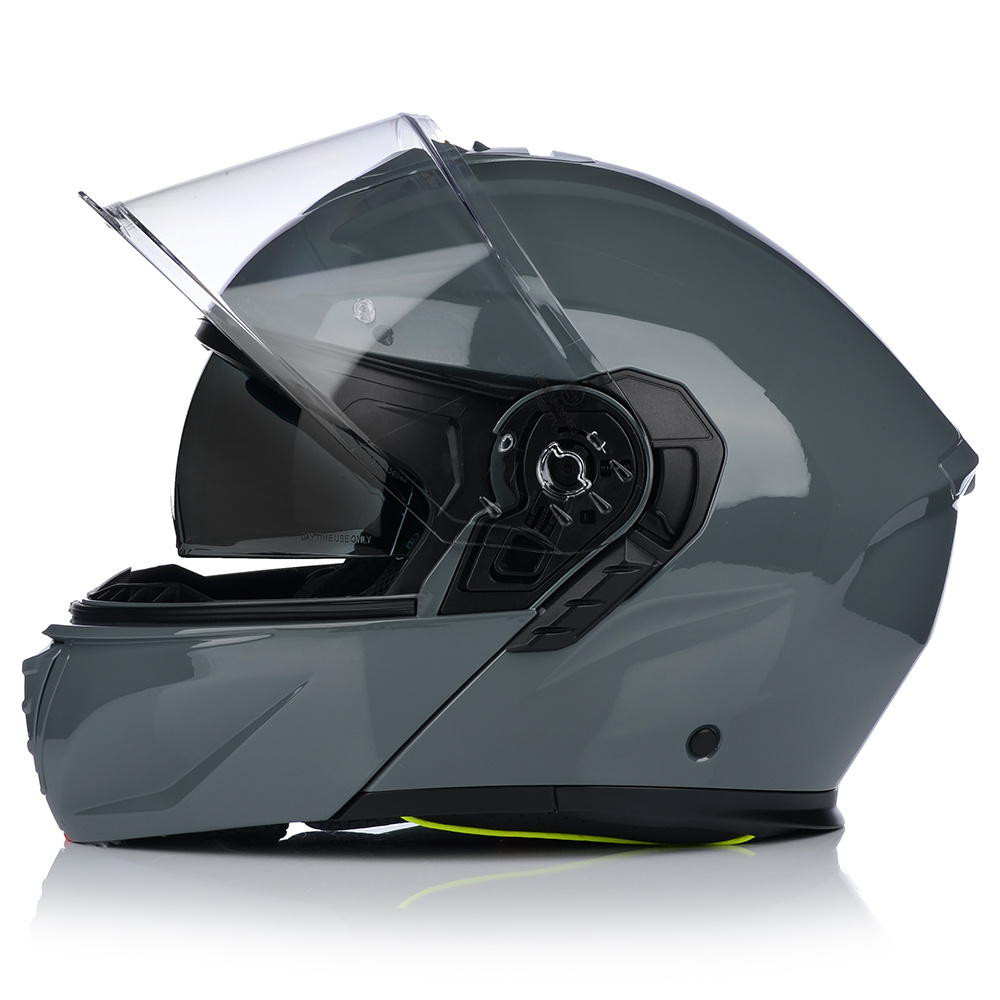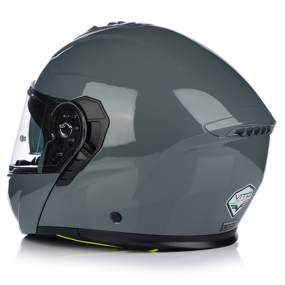 VITO FURIO jako jeden z nielicznych kasków posiada podwójną homologację - na jazdę z podniesioną i opuszczoną szczęką. Producent wyposażył produkt również w osłonę podbródka, oraz deflektor nosa, który zapobiega parowaniu szyby.