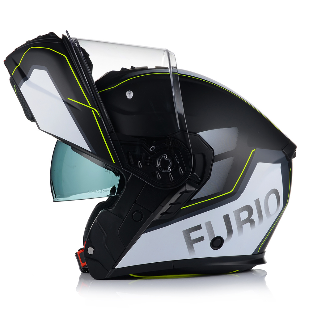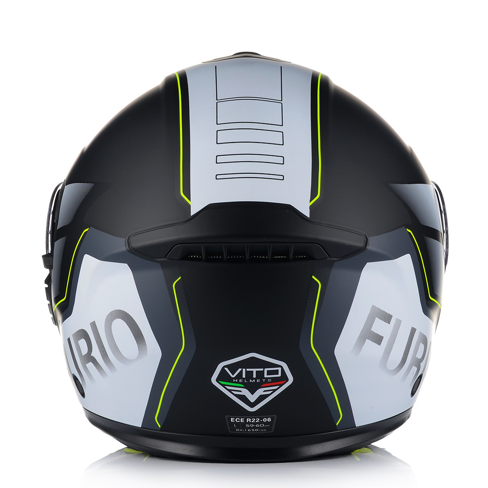 VITO FURIO jako jeden z nielicznych kasków posiada podwójną homologację - na jazdę z podniesioną i opuszczoną szczęką. Producent wyposażył produkt również w osłonę podbródka, oraz deflektor nosa, który zapobiega parowaniu szyby.