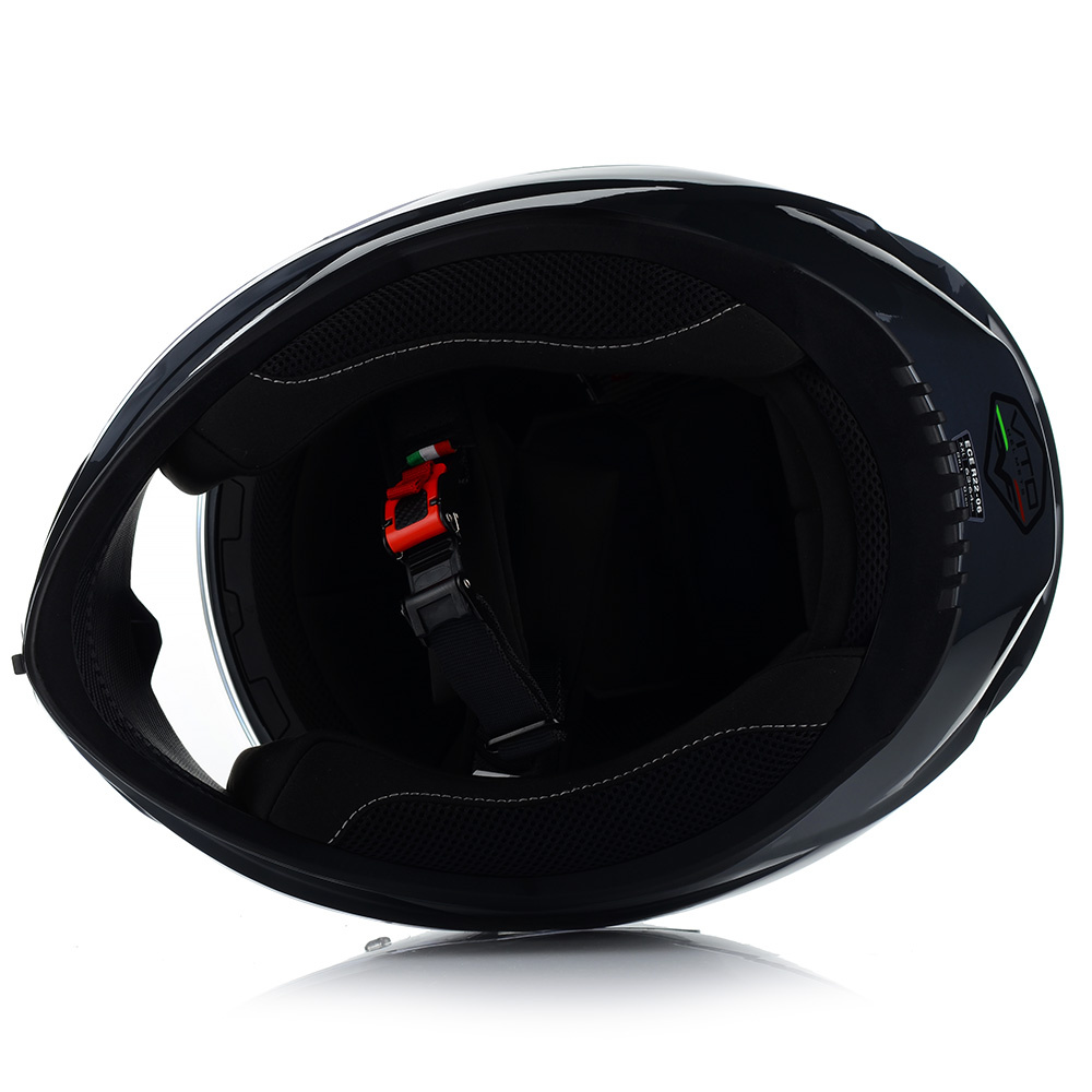 Vito Marelli to praktyczny kask z termoplastyczną skorupą, wizjerem clear anti-scratch z blokadą oraz mozliwością montażu Pinlocka dla lepszej widoczności. Komfort zapewnia system wentylacji, a dopasowanie ułatwia mikrometryczne zapięcie i wypinana, pralna wyściółka.