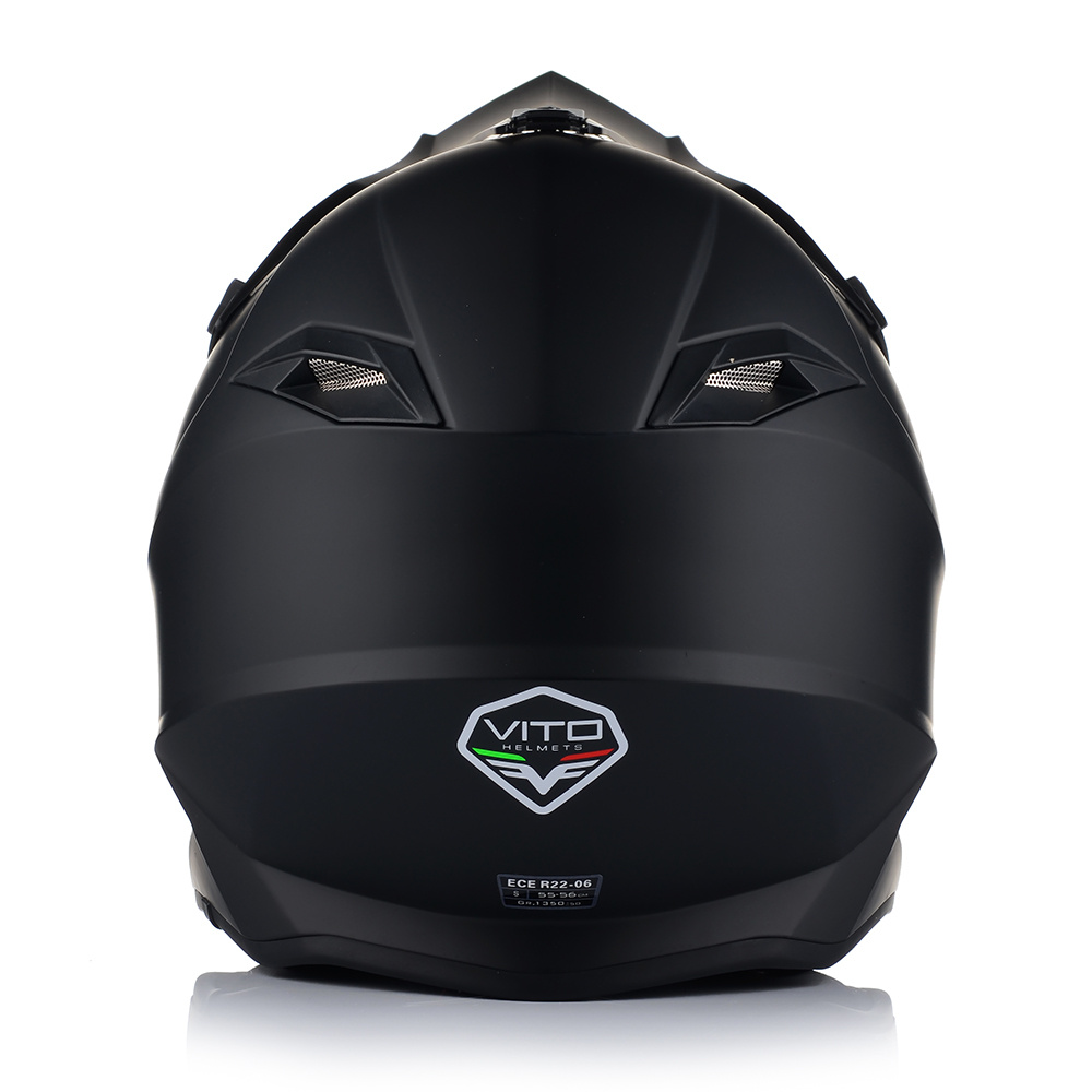Kask VITO Tivoli to bezpieczny kask motocyklowy, posiadający certyfikat bezpieczeństwa ECE R 22.06. Producent wyposażył ten model w pełni wyciągane wnętrze, które bez problemu mozna wybrać. Za wentylację odpowiadają duże otowory wentylacyjne umieszczone w szczęce i na czole, oraz wyloty z tyłu.