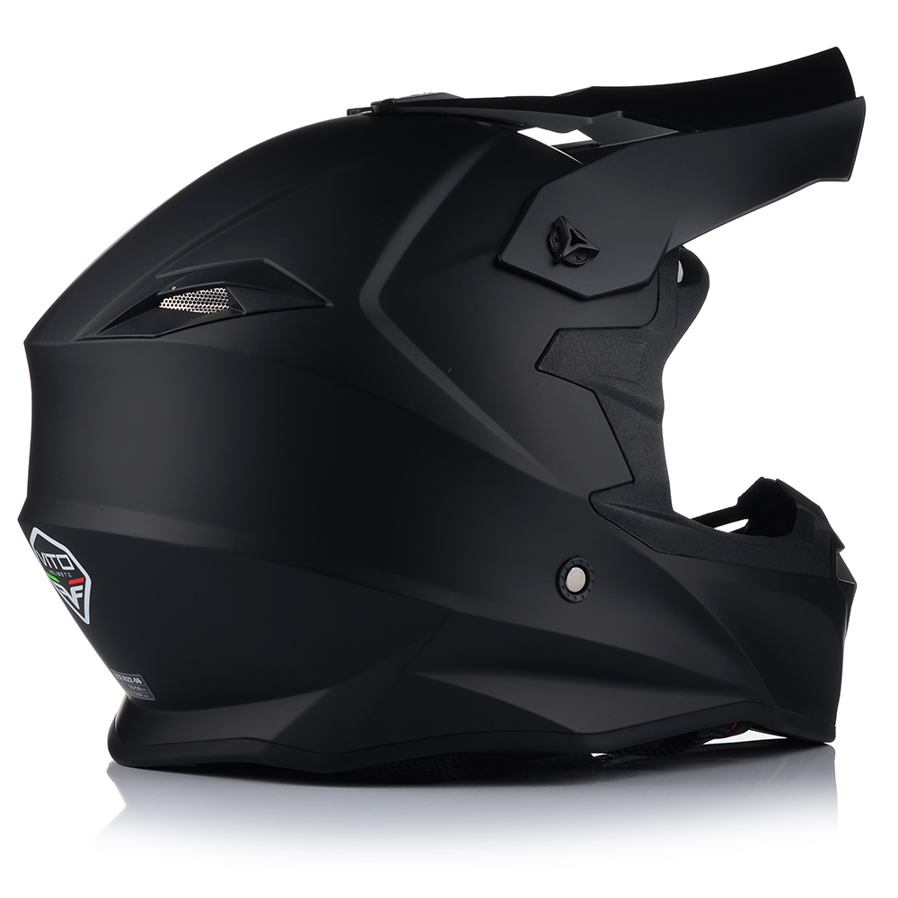 Kask VITO Tivoli to bezpieczny kask motocyklowy, posiadający certyfikat bezpieczeństwa ECE R 22.06. Producent wyposażył ten model w pełni wyciągane wnętrze, które bez problemu mozna wybrać. Za wentylację odpowiadają duże otowory wentylacyjne umieszczone w szczęce i na czole, oraz wyloty z tyłu.