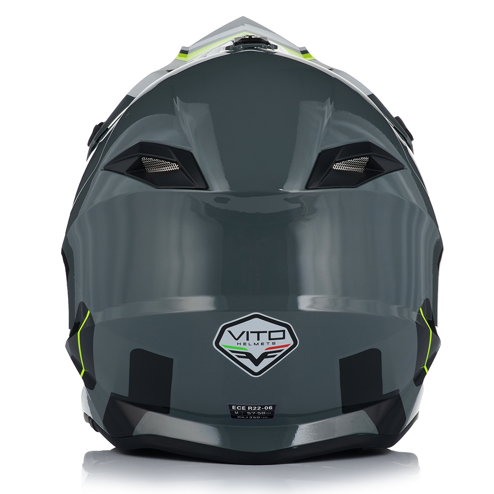Kask VITO Tivoli to bezpieczny kask motocyklowy, posiadający certyfikat bezpieczeństwa ECE R 22.06. Producent wyposażył ten model w pełni wyciągane wnętrze, które bez problemu mozna wybrać. Za wentylację odpowiadają duże otowory wentylacyjne umieszczone w szczęce i na czole, oraz wyloty z tyłu.