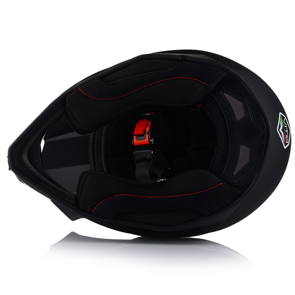 Kask VITO Tivoli to bezpieczny kask motocyklowy, posiadający certyfikat bezpieczeństwa ECE R 22.06. Producent wyposażył ten model w pełni wyciągane wnętrze, które bez problemu mozna wybrać. Za wentylację odpowiadają duże otowory wentylacyjne umieszczone w szczęce i na czole, oraz wyloty z tyłu.
