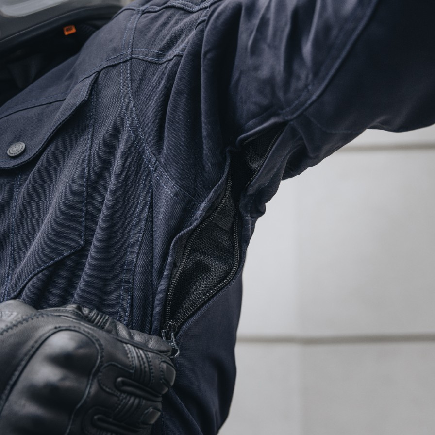 - Kanały wentylacyjne pod pachami zapinane na długie zamki błyskawiczne