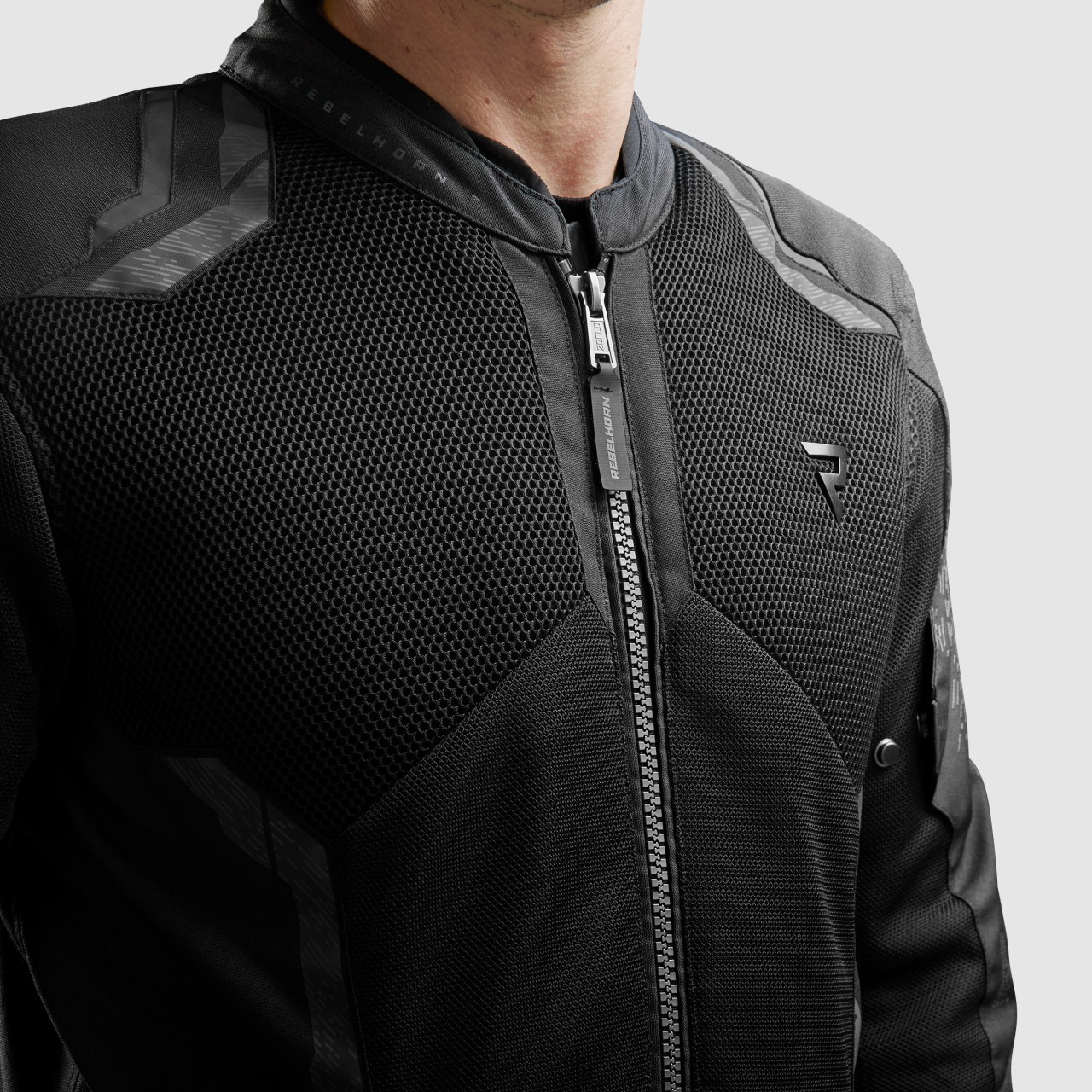Kurtka motocyklowa Rebelhorn JAX łączy unikalny design z niezawodnym bezpieczeństwem i komfortem jazdy. Dzięki zaawansowanym ochraniaczom, ergonomicznemu krojowi i wyglądowi, stanowi idealny wybór dla motocyklistów preferujących dynamiczną jazdę miejską. Inspiracją dla projektanta była idea harmonijnego połączenia człowieka z maszyną. JAX posiada subtelnie wkomponowane elementy 3D, które podkreślają unikalność kurtki.
