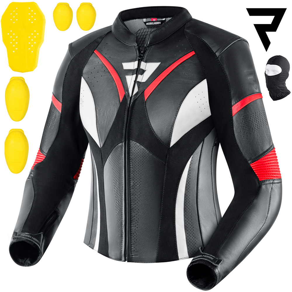 - Perforowane panele skórzane wzdłuż zamka, na klatce piersiowej, na ramionach oraz na łopatkach
