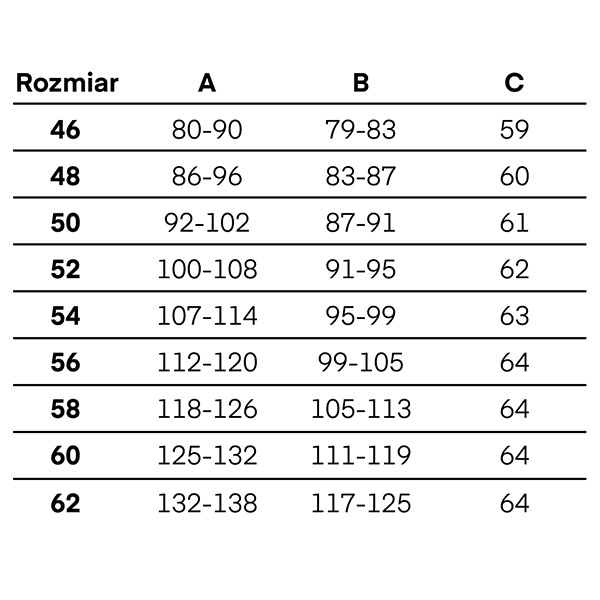 • aby prawidłowo dopasować kurtkę należy sugerować się podaną tabelą