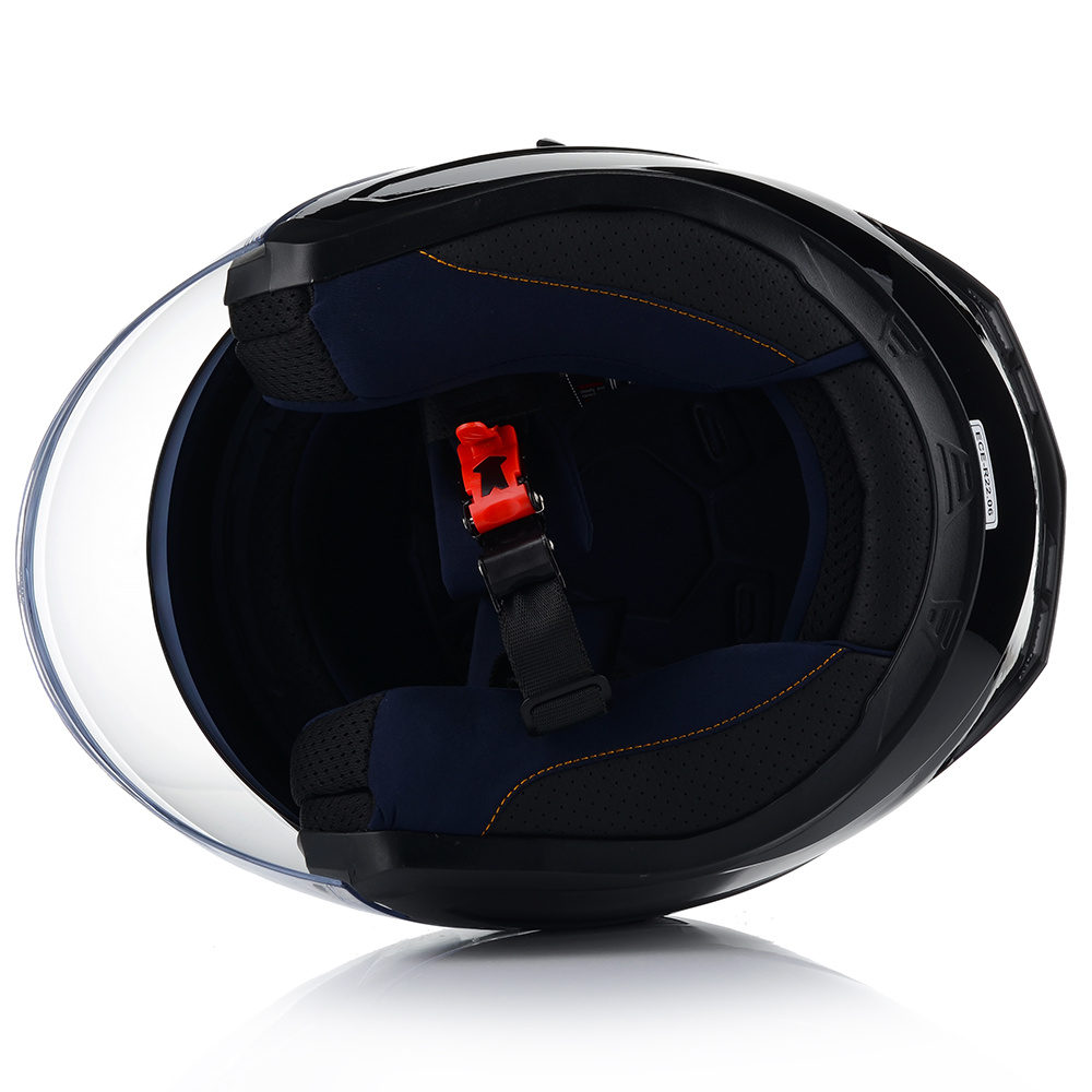 Kask posiada najnowszy certyfikat bezpieczeństwa ECER 22.06 - co oznacza że przeszedł rygorystyczne testy bezpieczństwa i jest dopuszczony do żytku publicznego. Dodatkowym atutem jest to iż kask posiada blendę przeciwsłoneczną chowaną w skorupę kasku, wyjmowane wnętrze i możliwość montażu zestawu głośnomówiącego.