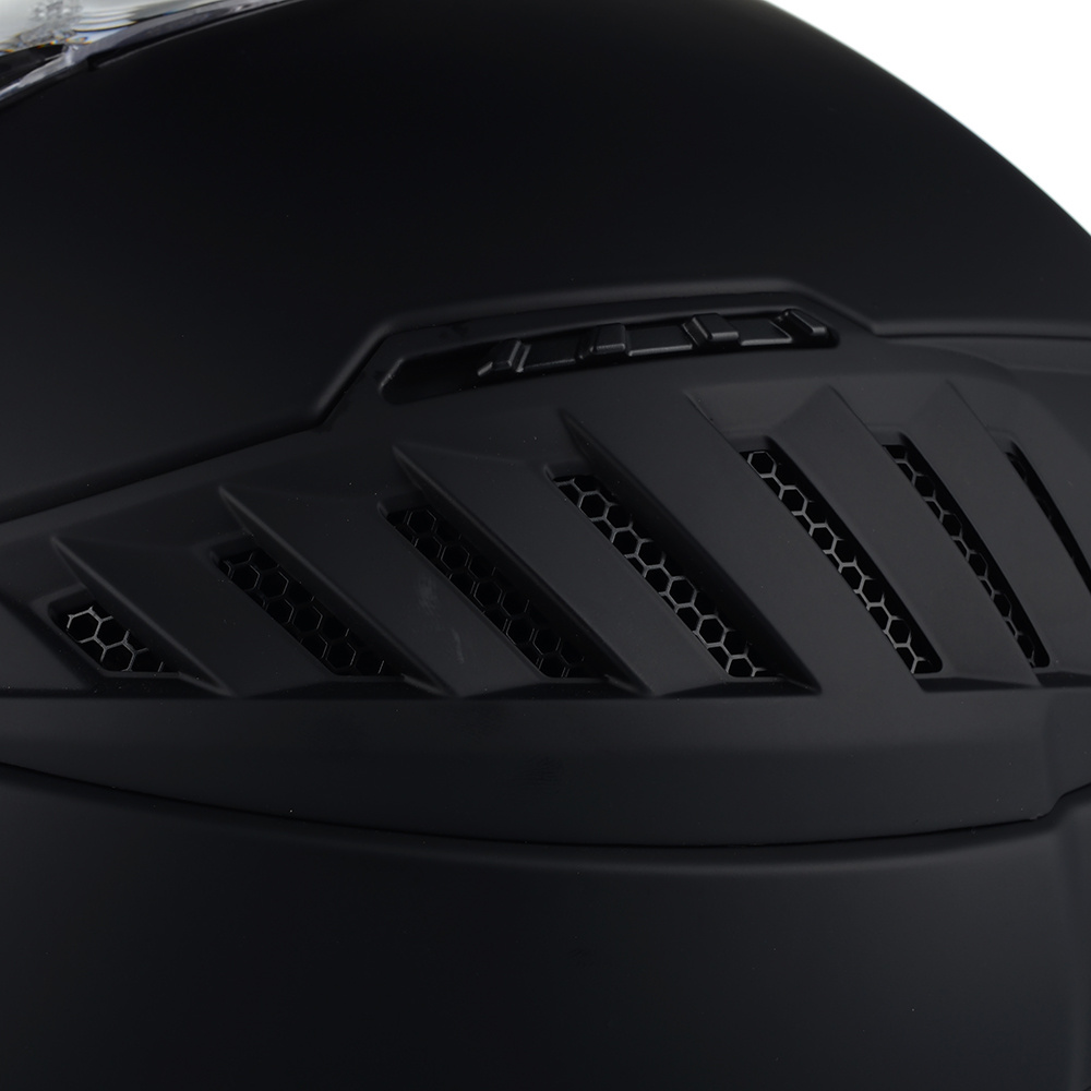 - Długa szyba zasłaniająca całą twarz (z wlotem powietrza)
