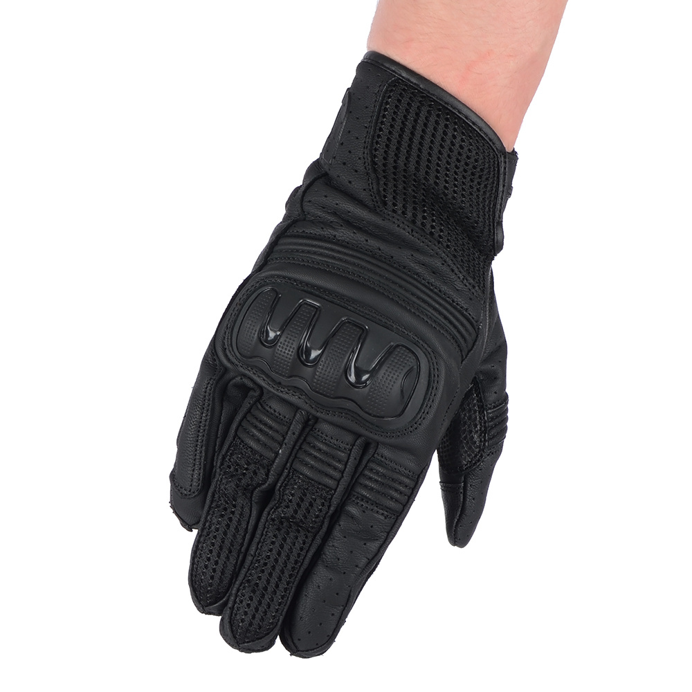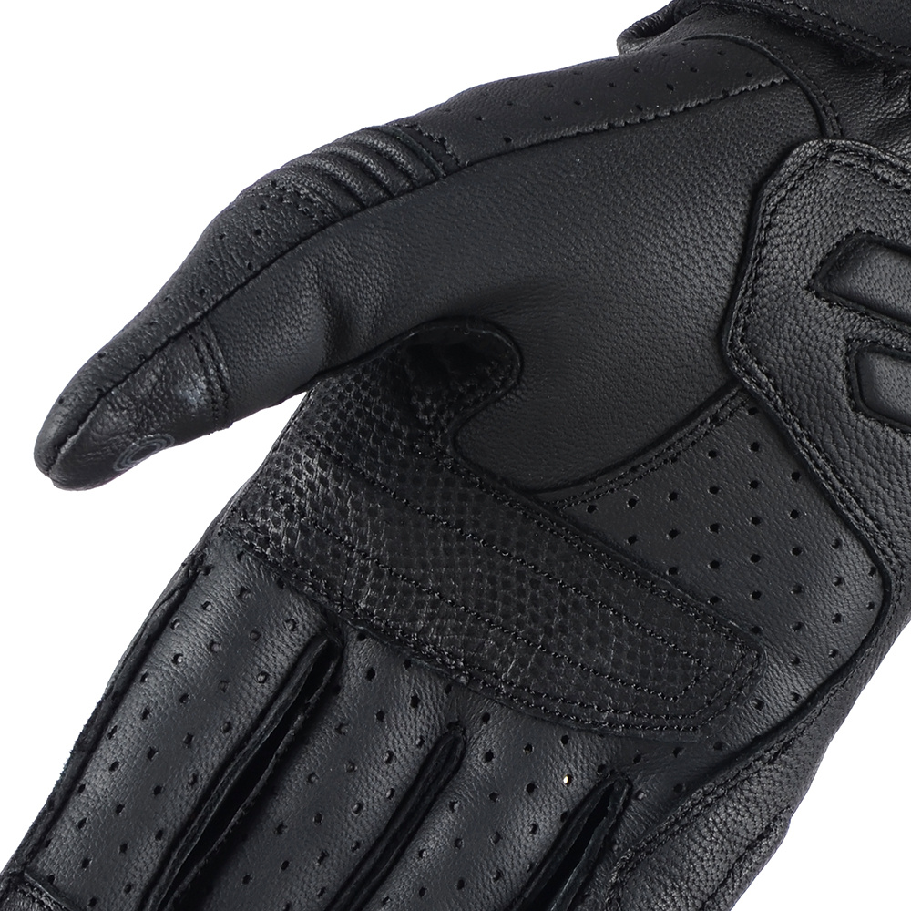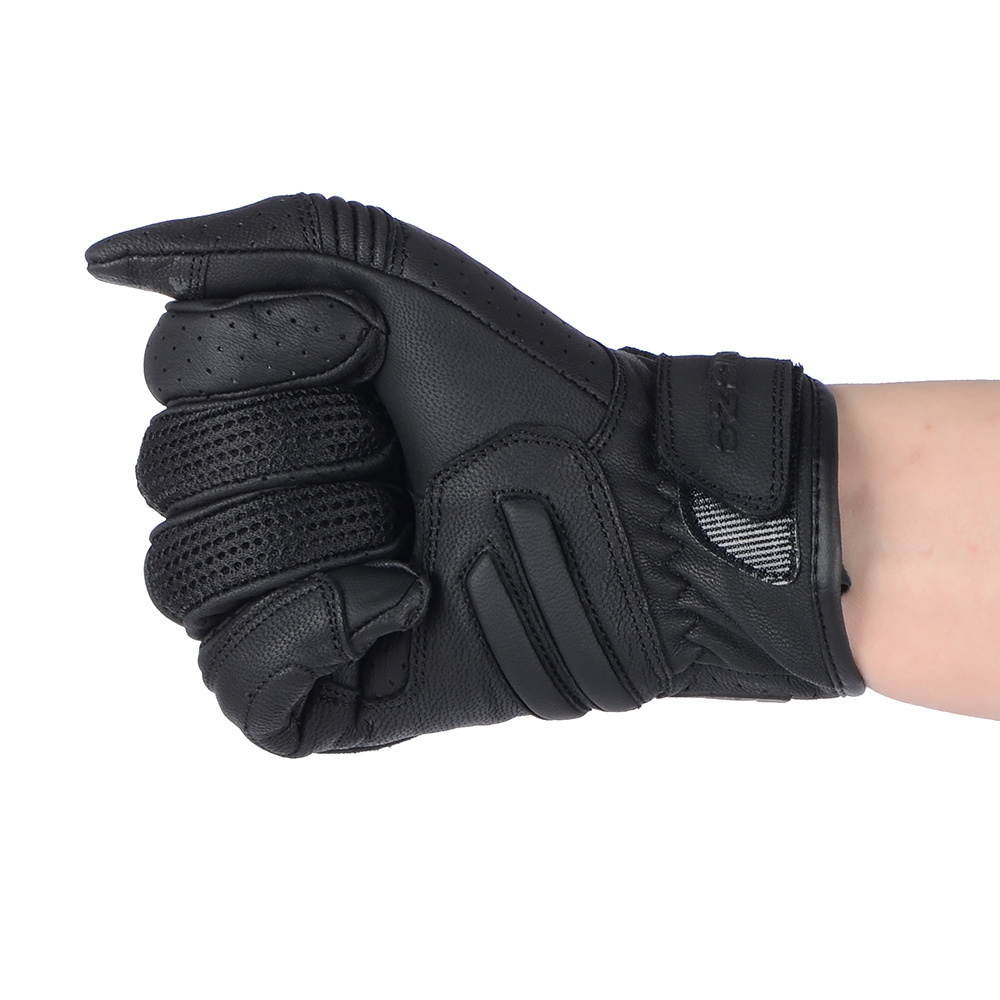 Rękawice motocyklowe ze skóry koziej z podszewką micro mesh, perforacją na dłoni i palcach i panelem polepszający chwyt kierownicy. Pod osłoną kostek znajdują się panele SAS-TEC. Wewnętrze uszyte z podwójnego materiału. Zewnętrzne szwy i elastyczne elementy zwiększają komfort użytkowania.