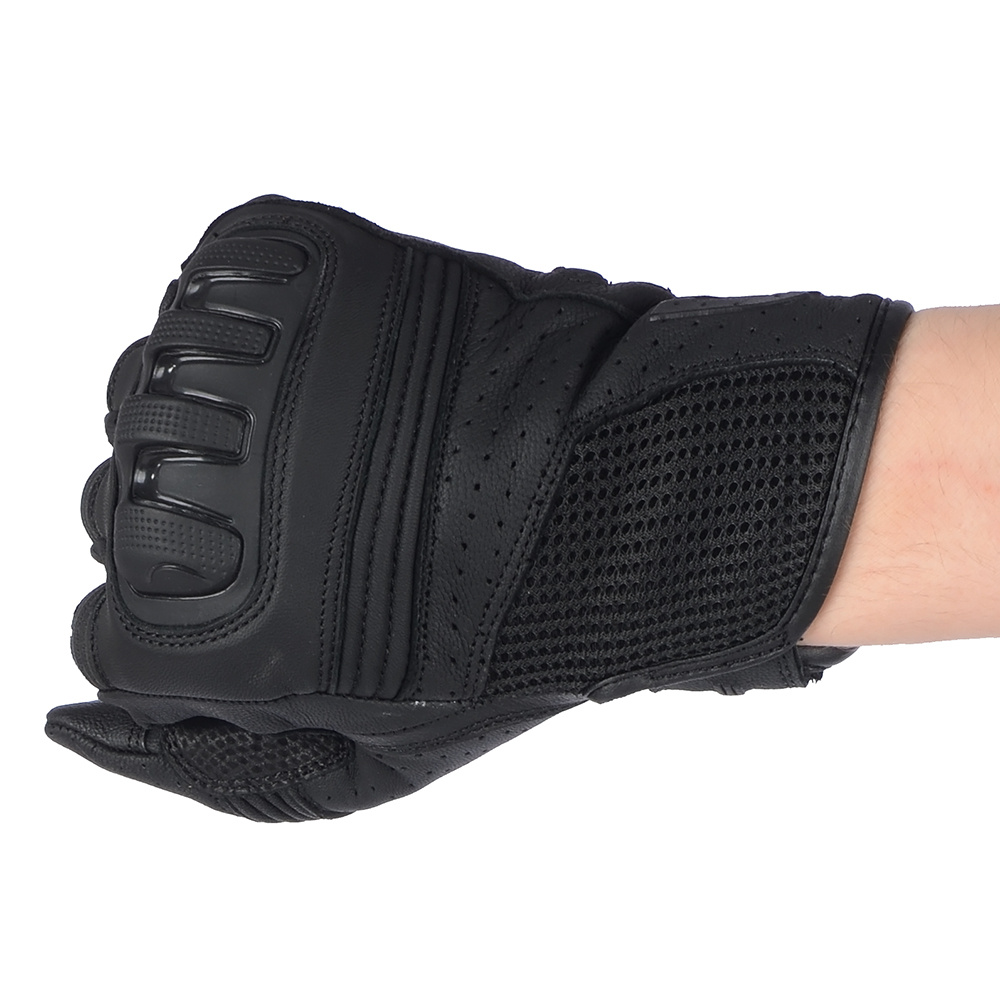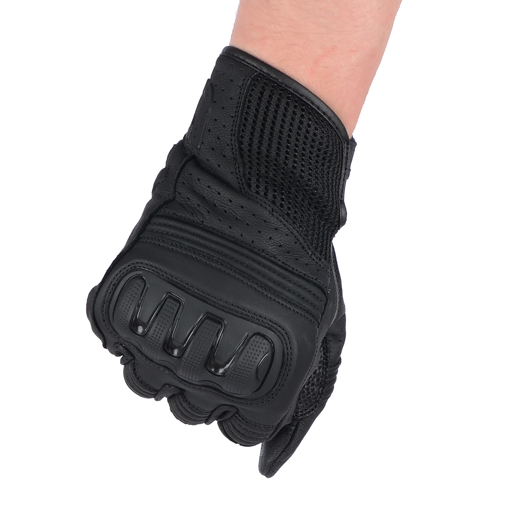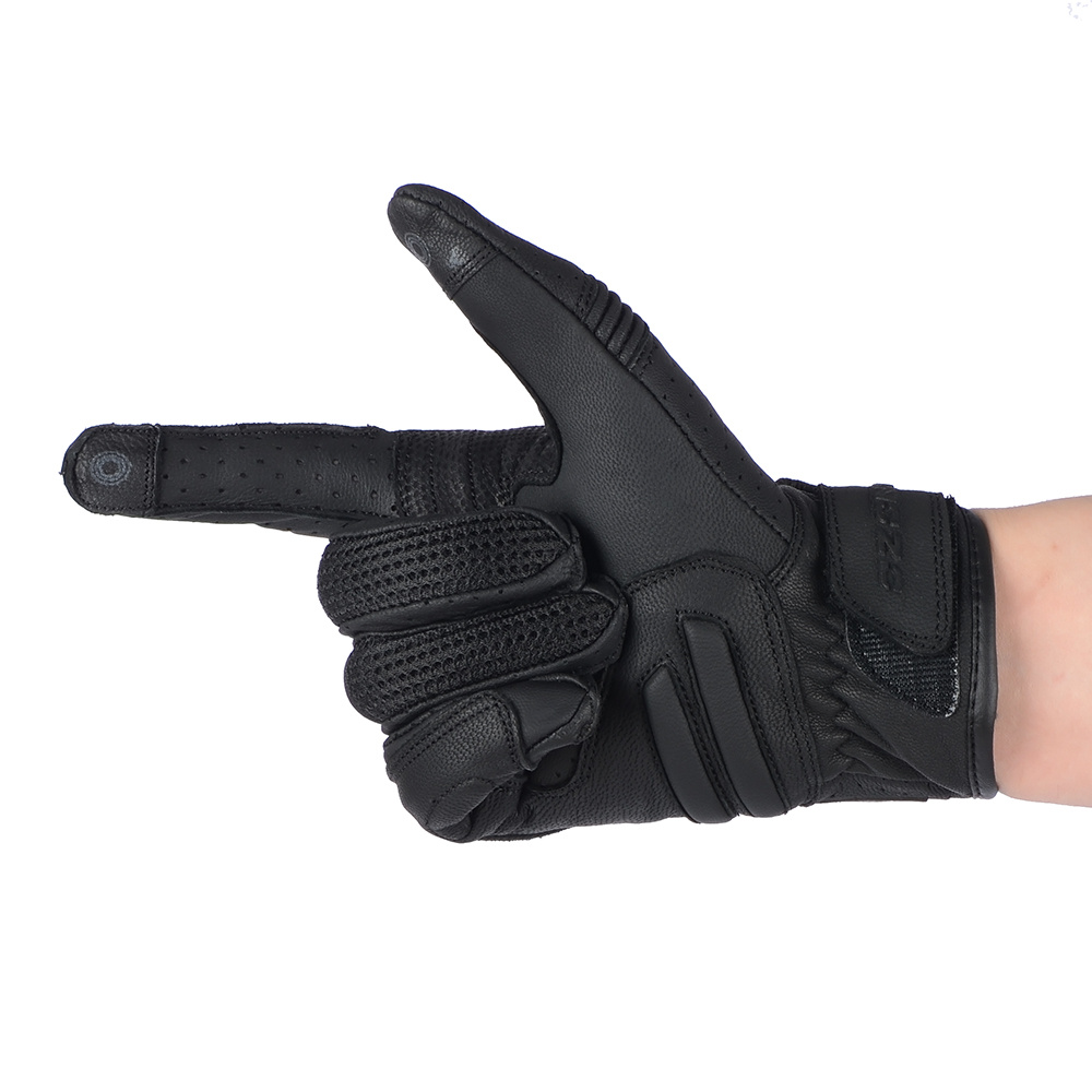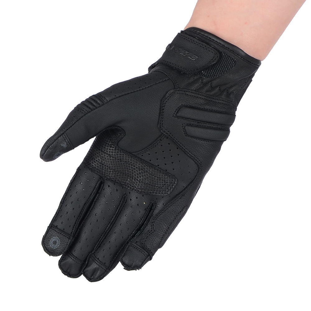 Rękawice motocyklowe ze skóry koziej z podszewką micro mesh, perforacją na dłoni i palcach i panelem polepszający chwyt kierownicy. Pod osłoną kostek znajdują się panele SAS-TEC. Wewnętrze uszyte z podwójnego materiału. Zewnętrzne szwy i elastyczne elementy zwiększają komfort użytkowania.