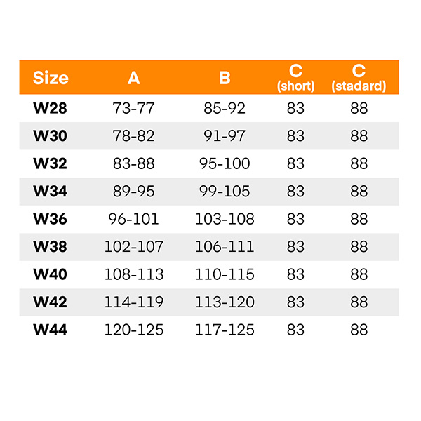 • aby prawidłowo dopasować spodnie należy sugerować się podaną tabelą