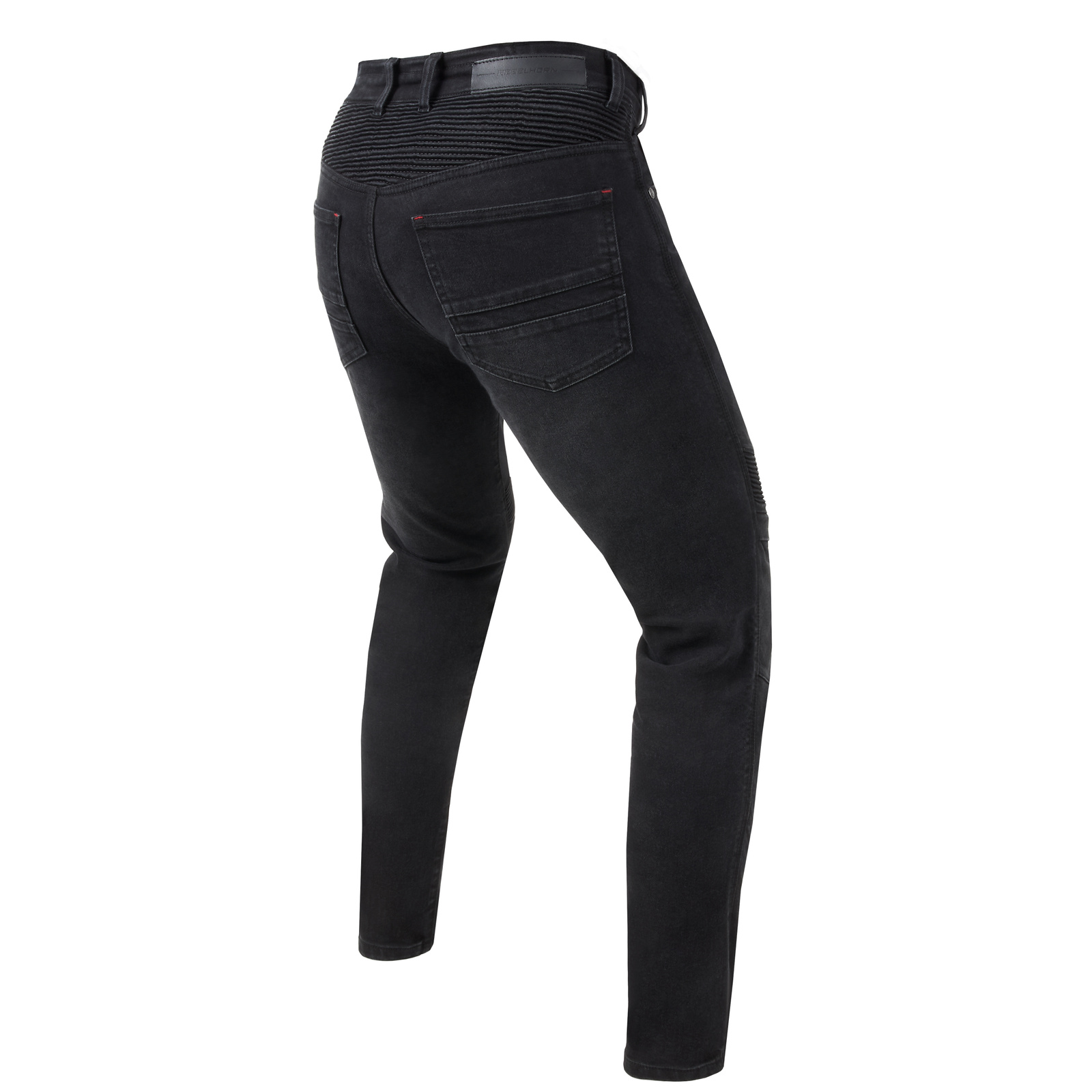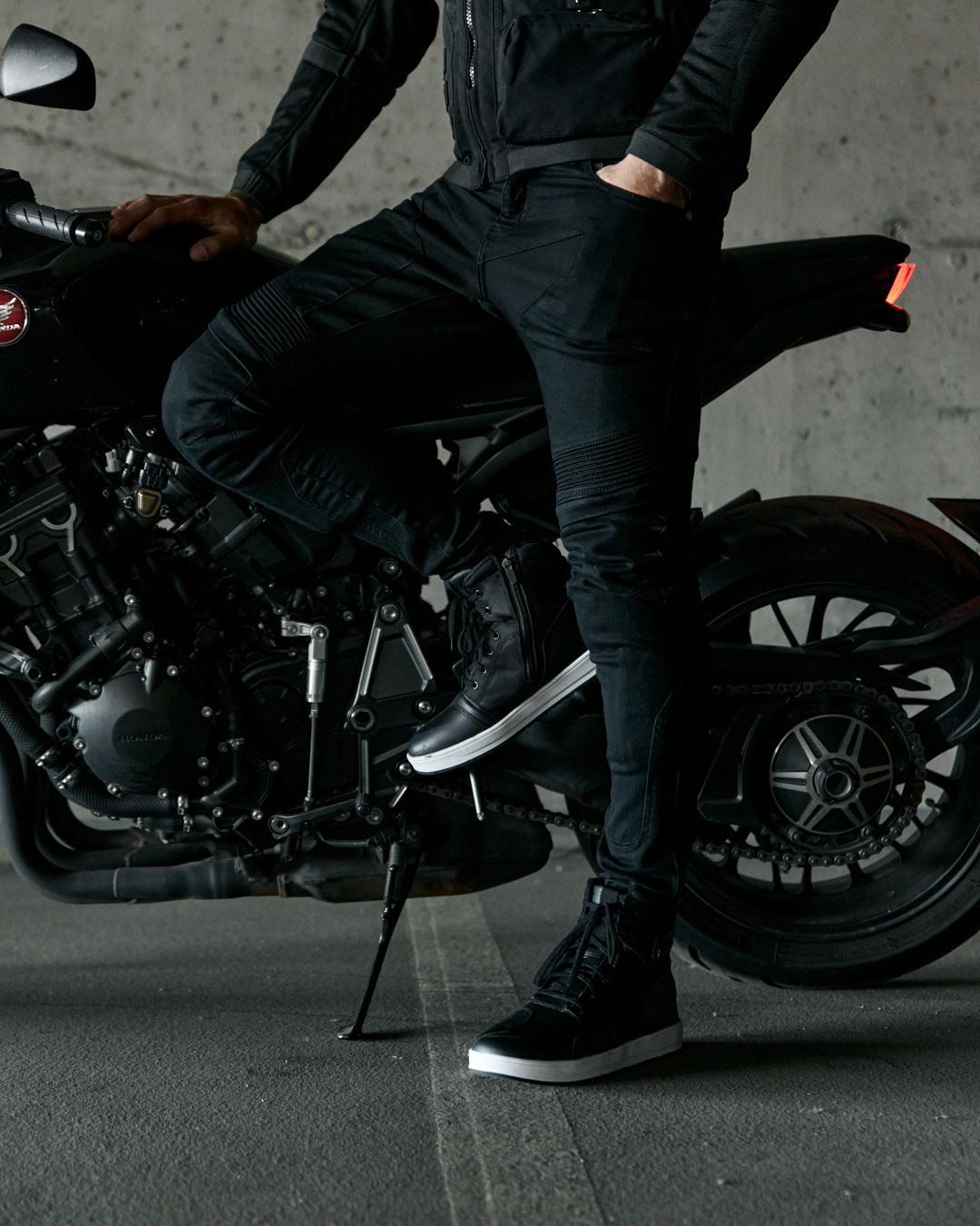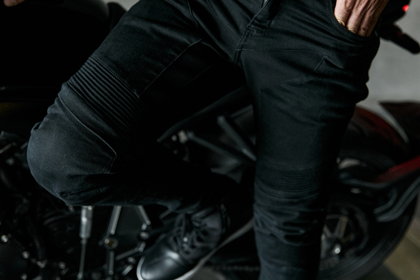 Materiał z dodatkiem elastanu gwarantuje optymalne dopasowanie i wygodę, a wstawki z materiału 4-way stretch w kroku ułatwiają wsiadanie na motocykl.