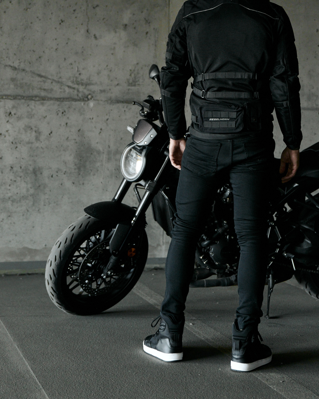 Jeansy motocyklowe Rebelhorn Eagle III gwarantują wygodę i komfort dzięki zastosowaniu elastycznych paneli harmonijkowych oraz 4-way strechu. Bezpieczeństwo zapewniają aramidowe panele na biodrach i w pasie oraz kolanach, sięgające aż do połowy kości piszczelowej oraz ochraniacze renomowanej marki SAS-TEC®. Rebelhorn Eagle III można spiąć z kurtką dzięki wszytemu, krótkiemu zamkowi.
