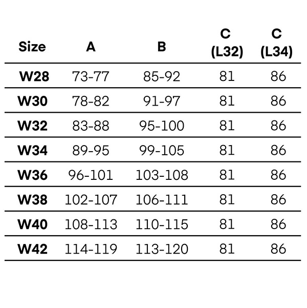 - aby prawidłowo dopasować spodnie należy sugerować się podaną tabelą