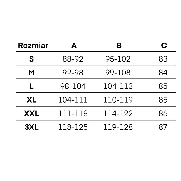 - aby prawidłowo dopasować spodnie należy sugerować się podaną tabelą