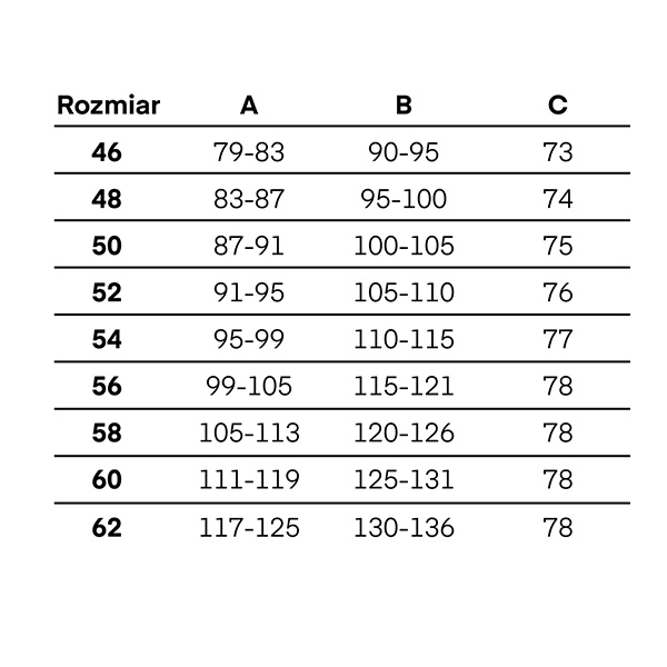 - aby prawidłowo dopasować spodnie należy sugerować się podaną tabelą